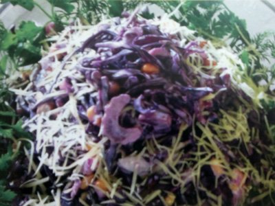 Салат «Вечірній етюд» Інгредієнти на 4 порції: – червонокачанна капуста – 250 г, – ріпчаста цибуля –Кулінарні рецепти